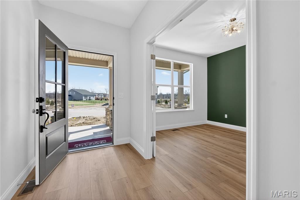 MOVE_IN READY! Discover timeless design and modern comfort in this Hamilton 2 located in the sought-after Cottleville Trails community. Thoughtfully designed with elegant finishes throughout, this home blends open-concept living with elevated details that make a lasting impression. Step inside to 9' ceilings on the first floor and a soaring 11' ceiling in the great room, creating an open and airy atmosphere. The great room features a 55 electric fireplace flanked by large windows, filling the space with natural light and warmth. The designer kitchen is the heart of the home, showcasing built-in double ovens, GE appliances, under-cabinet lighting, tall baseboards, and a butler's pantry, perfect for entertaining. Glass doors at the flex room, can lighting throughout, and open stairs with metal balusters to the lower level add sophisticated architectural touches. Outdoor living is just as impressive with an expanded 20' x 10' deck overlooking a walkout homesite, ideal for enjoying St. Louis summers. An irrigation system is already in place to keep your lawn looking pristine. The walkout basement features a 9' pour, offering ample potential for future finishing. Located just minutes from downtown Cottleville and served by the top-rated Francis Howell School District, this home combines McKelvey craftsmanship with community charm and convenience.