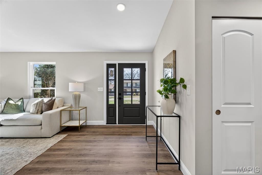 WOW! Jaw dropping & show stopping! Beautiful newly renovated open concept floor plan Ranch home with 3 main floor bedrooms, 3 full bathrooms, over 2500+ total sq ft, & newly finished lower level! Nestled on a corner lot in the desirable neighborhood of Reinke Woods in the heart of Ellisville, this home is a MUST SEE! You are welcomed into the soaring vaulted entryway & front family room that is light, bright & airy. The formal dining area is the perfect set up for entertaining (& impressing) family & friends doing holidays, gatherings or parties. Vaulted family room features gorgeous & trendy wood burning fireplace with mantle open to the gorgeous renovated kitchen. Let's talk about the newly renovated Kitchen - appointed with custom shaker cabinetry, beautiful quartz countertops carrying up the backsplash, stainless steel appliances and walk-in pantry - built in mind for a Chef! Head down the hallway to find the expansive primary bedroom suite with floor to ceiling tiled shower and huge walk-in closet. Two more generously sized bedrooms and beautifully finished hall bath. The finished lower level features an expansive Rec room with built in bar area plus FULL third bath. There is still a large unfinished space perfect for storage or future expansion. Main floor mud room & laundry, drywalled 2 car garage with newly poured driveway & patio for summer BBQs! Almost everything has been renovated - newly installed architectural roof, newly installed vinyl windows & 2 panel arched doors, newly installed flooring throughout, newly installed fixtures & lighting, it's like NEW without the new construction price tag. This the perfect home you have been searching for! This one is truly a gem! Schedule your private tour today! Agent Owned.